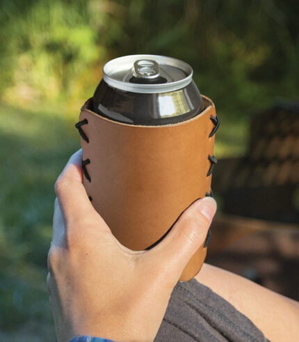 leather can holder holding drink can