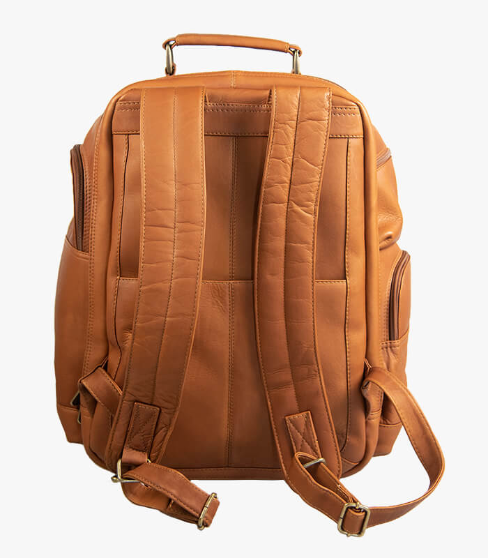 The rugged Alma back pack is built for work, play and travel. This back pack from Sarge Leather Company has pockets for books, pens, phones, water bottles and even fits a 17” laptop. It is crafted from top grain Colombian cowhide leather in saddle tan with a durable mocha brown nylon lining. It is accented with antique brass-finish hardware.