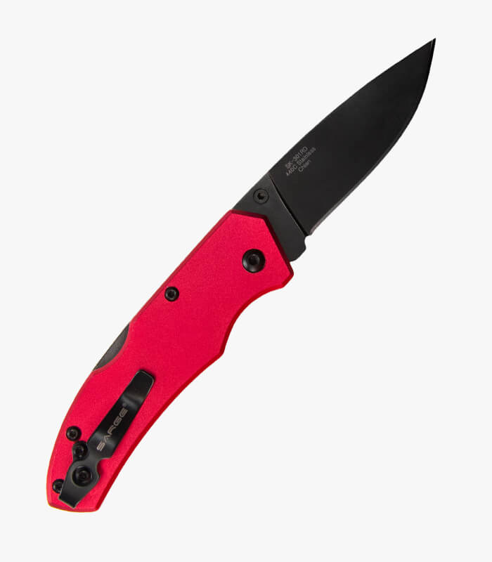 Blade: 3.25" Drop Point Steel: 8Cr13Mov Finish: Matte Stonewash Handle: Black/Red/Blue Anodized Aluminum Open: 7.75" Closed: 4.5" Lock: Slide Lock Includes: Reversable Wire Pocket clip Features: Ball Bearing Pivot Bolt System Packaging: 2pc Sarge Cardstock Box