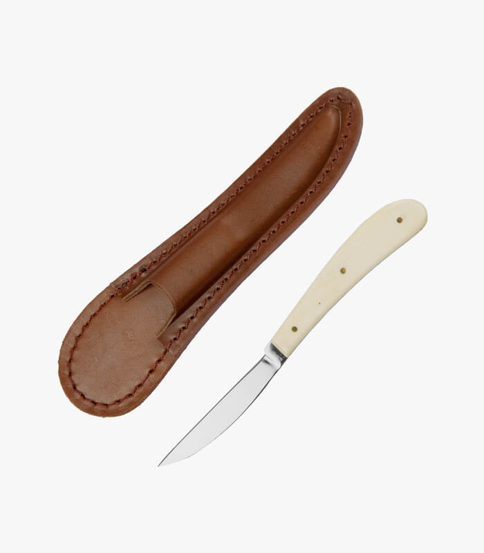 This natural bone handle desk knife is an elegant letter opener perfect for any home or office. It features a 2.75″ 440C stainless steel polished blade with brass pins for a high-end look and comes with a custom-fitted leather sheath.