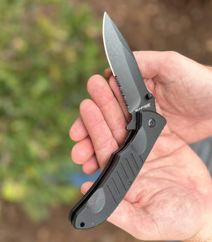 Looking for a tactical knife with a serrated blade? This is the knife for you! The 3.5″ partially serrated blade is perfect for the tougher tasks with more resistance. The Foxtrot features spring release for swift assist opening and includes a pocket clip for convenience. This is a tactical knife must-have. Sarge carries the best tactical pocket knives—get yours today!