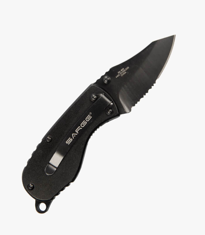 The stout design of this folding knife provides excellent blade control for precision cuts from a compact-sized tactical knife. The 2.5″ partially serrated 440C black stainless steel blade is effective for working with a variety of materials. The black non-reflective anodized aluminum handle comes with multiple carry options for use with pocket clip (included) or lanyard hole. For easy one-handed operations, this knife features a liner lock system with ambidextrous thumb stud. Made in China