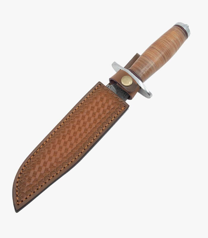 The timeless design of this fixed blade knife will leave a lasting impression for a customer appreciation gift or hunting tournament. Featuring a leather stacked handle where your logo will be laser engraved for a personal touch. This knife is paired with a handmade top-grain brown leather with belt loop.