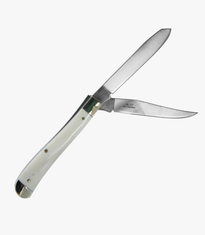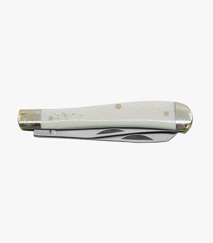 This pocket knife is made with a real white bone 3.75″ handle that is accented with brass pins, nickel silver bolsters. It utilizes a slip joint lock, keeping both 3″ 440C stainless steel blades well-secured.
