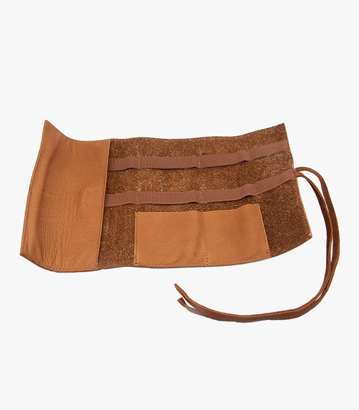 Crafted from Top Grain Colombian Cowhide Leather, the Travel Cable Organizer Roll features one compartment with a durable suede lining.