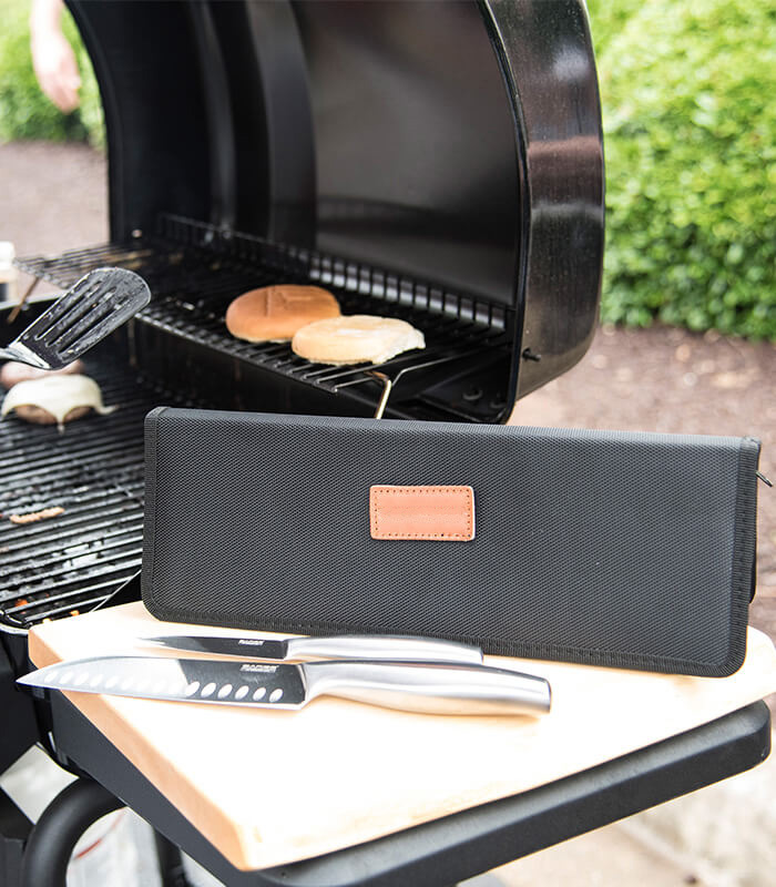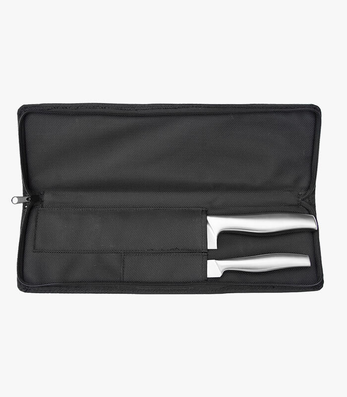The Traveling Chef 2pc knife set has a 7″ blade Santoku Knife for mincing, dicing, and slicing. And a 4″ paring knife for peeling and cutting fruit and vegetables. Each can be safely stored in the Zippered black nylon carrying case so you can cook on the go.