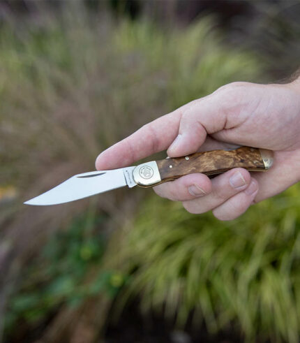 At 4.5 inches in the closed position, the Trigger is a Rosewood folder that is a bigger pocket knife that boasts a pocket clip. The unique, slightly concave carved design on the Rosewood handle seems to fit this knife perfectly. It features a liner lock black blade with a thumb stud. Made in China