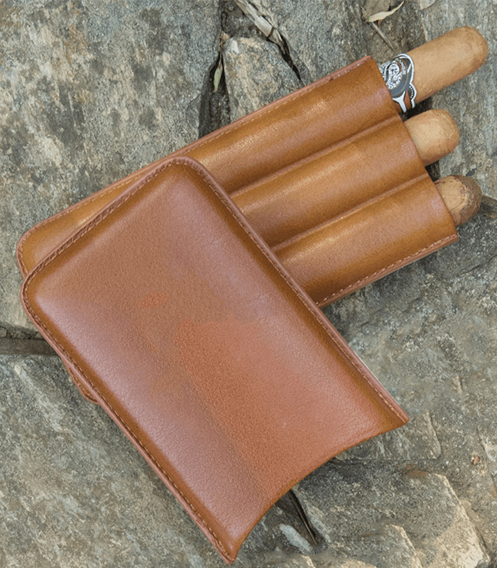 The Trio Cigar holder securely carries two of your favorite cigars, keeping them ready whenever you are. Crafted from genuine Italian leather in a rich saddle tan, this elegant accessory is designed to age beautifully over time.